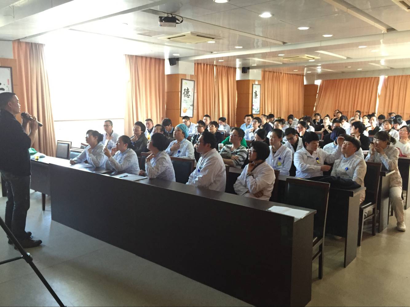 康復樓六樓會議室里座無虛席,臨時還加了不少的座位,從側(cè)面也反映了臨床醫(yī)務人員對實操技術(shù)的渴求。陳主任拿模型與器械邊演示,邊講解,大家一邊聽一邊記錄重點,來不及記的就趕緊拍照、錄像。為了教學更加生動,陳主任邀請一名志愿者上臺,在真人身上進行環(huán)甲膜位置的確定,并用筆做好標志。臺下不少醫(yī)生及護士都紛紛上臺請陳主任幫助確定環(huán)甲膜的位置。