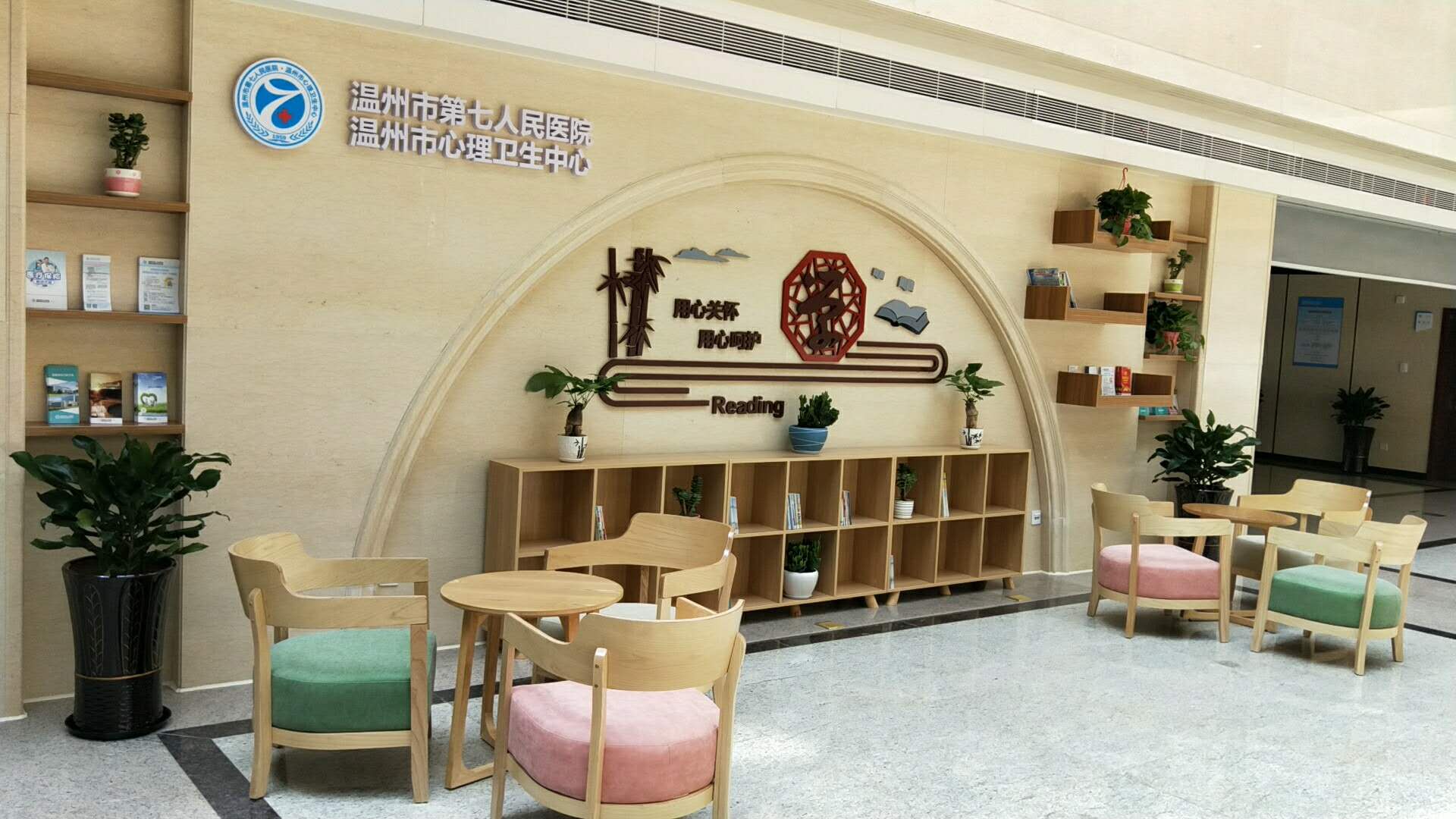 ?進(jìn)入溫州市第七人民醫(yī)院潘橋院區(qū),門診大廳寬敞、明亮,現(xiàn)又增設(shè)了一片溫馨的休息區(qū)。大廳中心位置天花板由玻璃構(gòu)成,在晴天陽光照射下來便是天然的白熾燈,在室內(nèi)也可以感受到陽光的溫暖。休息區(qū)內(nèi)書架上整齊擺放著著各類健康宣教資料、雜志、報紙、及醫(yī)院介紹等,患者及家屬在等待的同時,也能放松心情,緩解等待焦慮的情緒。暖色的桌椅能讓人感受到醫(yī)院溫馨的氛圍,家屬之間也可以坐下來互相溝通交流。